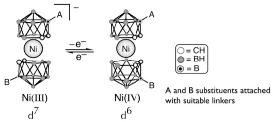 - Sivaev, I.B.; Bregadze, V.I. Chemistry of nickel and iron bis(dicarbollides). A review. J. Organomet. Chem. 2000, 614–615, 27–36. [Google Scholar] [CrossRef]