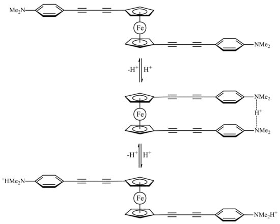 - Toyama, T.; Komori, S.; Yoshino, J.; Hayashi, N.; Higuchi, H. Synthesis and properties of 1,1′-bis[p-(N,N-dimethylaminophenyl)butadiynyl]ferrocene: A methodology for proton-mediated reversible conformation control of two function sites. Tetrahedron Lett. 2013, 54, 66–71. [Google Scholar] [CrossRef]