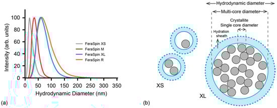 (a) Log-normal distributions of intensity-weighted hydrodynamic diameter of FeraSpin R, XS, M and XL, respectively as determined from DLS; (b) Schematic diagram illustrating the magnetic single-core-diameter (crystallite), of a multi-core diameter and the hydrodynamic diameter of sample FeraSpin XS versus FeraSpin XL.