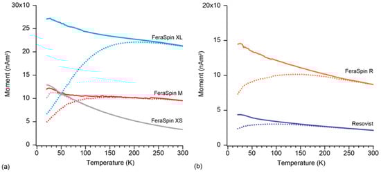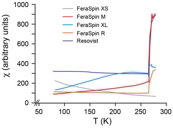 Monitoring low-field, mass susceptibility (χ) as a function of low temperature shows that there is an abrupt loss at about 265 K in all samples (Figure 2) from the FeraSpin samples and Resovist. This susceptibility loss is characteristic for Morin transition in hematite (TM) [32,33], which indicates that all size fractions have undergone some degree of surface oxidation. The Morin transition is not readily apparent for FeraSpin XS, which can be suppressed due to high internal stress in very small particles [34,35]. The absence of a Verwey transition in all samples further indicates that the original Fe3O4 has experienced some degree of oxidation to γ-Fe2O3 [36].