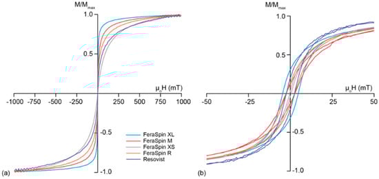 The room temperature (RT) magnetic hysteresis loops of the particles in suspension are closed with virtually zero remanence for FeraSpin R, its multi-core size fractions (FeraSpi Series), and Resovist (Figure 3a), which signifies a predominance of SP particles. The magnetization curve of each sample shows a steep initial increase, but it should be noted that none of the samples reach magnetic saturation in a field of 1 T. This is due to the presence of α-Fe2O3 [37], although ultra-fine particles may also prevent saturation due to surface anisotropy [38]. Measurements were repeated on dried samples (data not shown), and there was no observable difference in the hysteresis loop, which supports that the samples are made up largely of particles with SP behavior, and the closed hysteresis loop is not due to physical (Brownian) rotation of the particles during measurement.