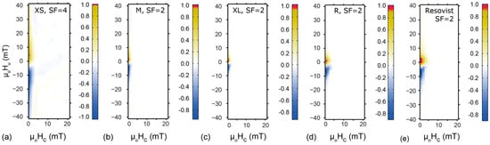 FORC distributions for (a–c) FeraSpin fractions; (d) FeraSpin R and (e) Resovist. Material name and smoothing factor SF are indicated at the top of each diagram.