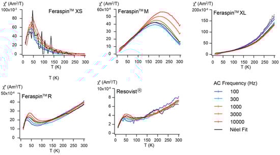 AC susceptibility is used to determine the origin of thermal relaxation and magnetic interaction by decomposing it into its in-phase (χ′) and out-of-phase (χ″) susceptibilities (Figure 7). For all samples χ″ shows a good agreement with Néel relaxation, also known as the π/2-law [41,42], which indicates that thermal relaxation is solely due to the SP component in the samples. Each sample exhibits a unique χ″ susceptibility spectrum, where the temperature of peak χ″ is related to the average particle size under which the particles undergo blocking. Blocking temperature decreases from FeraSpin XL to FeraSpin M to FeraSpin XS. The absence of a true peak and the weak frequency dependency over the measured temperature range in χ″ in FeraSpin XL, indicates that the average TB is close to room temperature. FeraSpin R and Resovist carry two TB, one at approximately 40 K representing contribution from fine particles and the second around 300 K that is indicative of larger particles. This bimodal distribution has been modeled from measurements of magnetization versus frequency [43]. Because FeraSpin XS and FeraSpin M display χ″ susceptibility characteristic for a unimodal size distribution, the Néel-Brown equation was used to evaluate the pre-factor or attempt time, τo. In this case τo = 9.9 × 10−132 s for FeraSpin XS. This has no physical meaning, and is interpreted as reflecting interaction in the particle system. FeraSpin M has τo = 1.1 × 10−14 s, which is slightly high with respect to the empirically defined range of 10−8 to 10−11 s [44,45], which suggests that interaction may be influencing the magnetic properties to some extent.