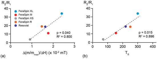Relaxivity ratio as a function of (a) the initial slope of the moment normalized magnetization curve, up to 20 mT; and (b) average TS. In both cases the probability value is <0.05, suggesting >95% significance of the relationship between the variables in the linear regression model of the data set. R-squared is a statistical measure of how close the data are to the fitted regression line (dashed line).
