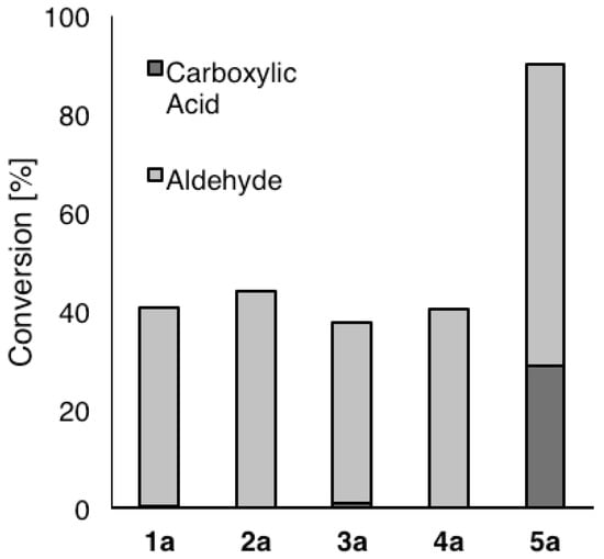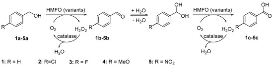 To eliminate potential sources of errors arising from different protein expression levels and background reactions only purified enzymes were tested [21,22,23]. In an initial experiment, the performance of wild-type HMFO in the oxidation of benzylic alcohols was evaluated with substrates bearing electron-withdrawing and -donating groups in the p-position (1a–5a) after 24 h (Figure 2). All substrates were readily oxidized to the corresponding aldehydes 1b–5b. To our delight, the highly activated p-nitrobenzyl alcohol 5a was over-oxidized to carboxylic acid 5c with 29% conversion, while substrates 1a–4a showed only traces of carboxylic acid formation (<1%). This can be explained by the strong electron-withdrawing p-nitro-group of 5a, which leads to ~15% hydrated gem-diol in equilibrium [24]. According to the literature, the ratio between the aldehyde and its (gem-diol) hydrate remains constant during a similar enzymatic redox reaction [24,25], which is experimentally supported by the fact that identical endpoint results were obtained for reactions using pre-incubated aldehyde (see SI). This means that the rate of aldehyde hydration is not rate limiting, but the position of the equilibrium.