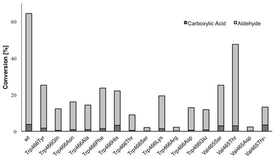 Most variants showed a similar chemo-selectivity for carboxylic acid/aldehyde formation of 1:12 to 1:15 as the wild type. Although Trp466Ser, Trp466Arg, and Val465Asp variants showed enhanced over-oxidation, their overall activity was disappointing (<5%). In contrast, Trp466His and Val465Ser mutants showed 2–3-fold enhanced acid formation by maintaining reasonable overall activities (~25%).