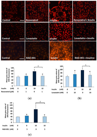 Microscopic detection of superoxide formation using the dye DHE in NRK cells treated for 15 min with (a) 1 μM resveratrol; (b) 10 nM lovastatin and (c) 5 nM RAD-001 then addition of 10 nM insulin for 30 min in the presence of DHE. Quantification of DHE fluorescence was done by measuring the mean grey value of 200 cells using image j software. (*) Significantly different from control, (Δ) significantly different from insulin and (o) not significantly different from control. Scale bars 50 μm.