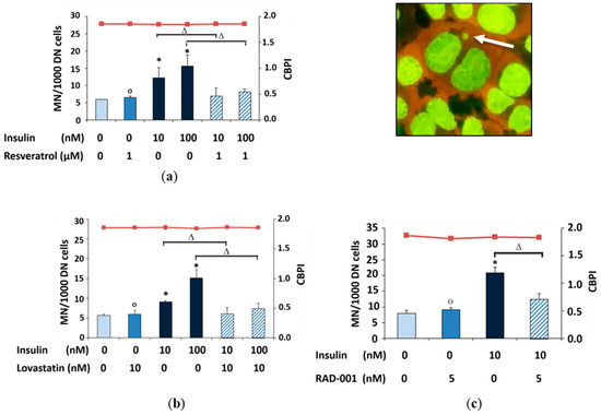 Micronuclei are small chromatin containing structures in the cytoplasm of cells, which represent a subtype of chromosomal aberrations. 3 × 106 Cells/mL were incubated with resveratrol, lovastatin and RAD-001 for 15 min and followed by addition of insulin for 4 h in 3 mL medium. After that, the medium was removed and replaced by fresh culture medium with cytochalasin B (3 μg/mL) after washing with PBS. After a further 20–22 h, cells were harvested, brought onto glass slides by cytospin centrifugation, and fixed in methanol (−20 °C) for at least two hours. Before counting, cells were stained for 3 min with Gel Green (10 μL stock solution in 990 μL distilled water), washed twice with PBS buffer, and mounted for microscopy. Due to the cytokinesis inhibitor cytochalasin B, mitosis results in double-nucleated cells. From each of the 2 slides, 1000 such double nucleated cells were evaluated for micronuclei, and the average was calculated. For substance combinations, concentrations which were described as effective in the literature and had been found not toxic in preliminary experiments were applied. Additionally, the cytokinesis-block proliferation index (CBPI) was calculated as an assessment of potential cytostatic effects from 1000 cells per sample using the following formula: CBPI = (number of mononucleated cells + 2 × number of double nucleated cells + 3 × number of multinucleated cells)/(mononucleated + double nucleated + multinucleated cells).