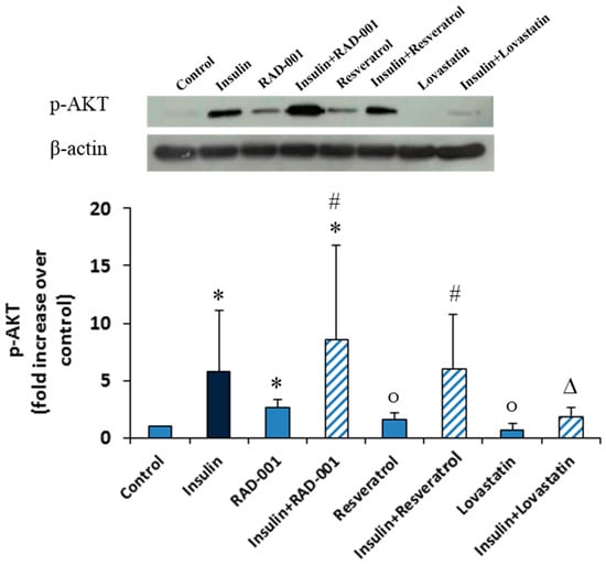p-AKT level in NRK cells treated with 10 nM insulin, 5 nM RAD-001, 1 μM resveratrol and 10 nM lovastatin and their combination with insulin for 2 h and analyzed by Western blotting. Blots from 3 independent experiments were used for quantification. (*) Significantly different from control, (Δ) significantly different from insulin, (o) not significantly different from control and (#) not significantly different from insulin.