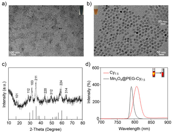 Various synthesis methods have been selected for preparation of the Mn3O4 NPs [24,25]. However, it is difficult to get uniform NPs to meet the desired requirements. In this work, Mn3O4 NPs were prepared according to the method reported by Hyeon [24]. As shown in Figure 1, the uniform Mn3O4 NPs were monodispersed in a nonpolar organic solvent (Figure 1a, inset) and had a small spherical shape of approximately 8 nm, which was consistent with previous reports [24]. Furthermore, the hydrophobic Mn3O4 NPs were successfully transferred to the aqueous phase by coating them with amine-functionalized PEG lipids (1,2-Distearoyl-sn-glycero-3-phosphoethanolamine (DSPE)-PEG2000-NH2) and Cy7.5-NHS (N-Hydroxysuccinimide) that showed good stability in an aqueous solution (Figure 1b, inset). In addition, dynamic light scattering (DLS) measurements showed that Mn3O4@PEG had a hydrodynamic diameter of 10 ± 2.3 nm, similar to the observation from TEM (Figure S1). Meanwhile, the zeta-potential value of Mn3O4@PEG (25.7 ± 4.3 mV) further verified the existence of the NH2 group (Figure S2). After further conjugation with Cy7.5-NHS, the zeta-potential values changed significantly to −10.3 ± 2.6 mV (Mn3O4@PEG-Cy7.5), suggesting successful conjugation of Cy7.5 to the surface of Mn3O4@PEG-NH2. Moreover, in order to further confirm the conjugation, the absorption spectra of the Cy7.5, M3O4, M3O4@PEG-Cy7.5 and DSPE-PEG-NH2 measured by UV spectrophotometer was also conducted. It can be seen that the Cy7.5 and M3O4@PEG-Cy7.5 NPs have obvious absorption spectra at 790 nm (Figure S3), which was ascribed to the characteristics of Cy7.5. Figure 1c shows the XRD pattern of the Mn3O4 NPs. Clearly, all the diffraction peaks of the as-prepared Mn3O4 NPs can be indexed as a tetragonal Mn3O4 phase (Joint Committee for Powder Diffraction Standards (JCPDS) card no: 24-0734) without metallic manganese or other oxide phases, indicating that the as-synthesized Mn3O4 NPs are crystalline and of high purity.