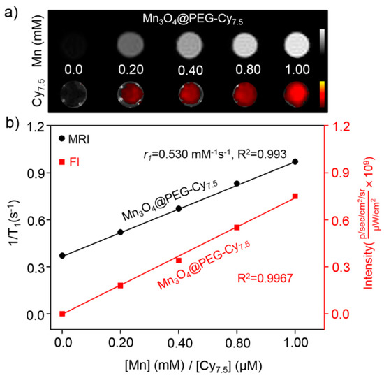 The relaxation and fluorescent properties of Mn3O4@PEG-Cy7.5 NPs. (a) T1-weighted magnetic resonance (MR) and fluorescent imaging of Mn3O4@PEG-Cy7.5 NPs; (b) T1 relaxivity plot and fluorescent intensity of aqueous suspensions of Mn3O4@PEG-Cy7.5 NPs on a 7 T magnetic resonance imaging (MRI) and fluorescent imaging system.
