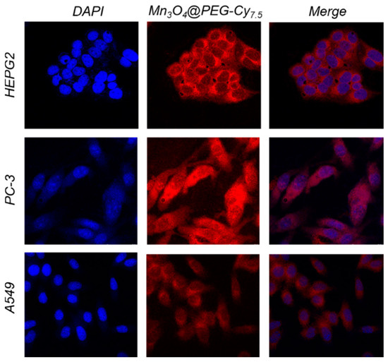 To further elaborate on the in vivo distribution and stability of Mn3O4@PEG-Cy7.5 NPs, we chose PC-3, A549, and HEPG2 cells as models to evaluate the cellular uptake ability of Mn3O4@PEG-Cy7.5 NPs in vitro. For this purpose, cellular uptake of NPs was verified in Figure 3. A confocal laser scanning microscopic study demonstrated that the Mn3O4@PEG-Cy7.5 NPs (red) were distributed in the cytoplasm and were mainly localized in the peripheral area of the nucleus. To further trace the distribution of Mn3O4@PEG-Cy7.5 NPs in the cells, quantitative analysis of Mn3O4@PEG-Cy7.5 NPs was investigated based on the detection of the content of Mn by Inductively Coupled Plasma-Atomic Emission Spectrometry (ICP-AES) at 48 h (Figure S5). After collection of the cells, they were subjected to ICP-AES analysis, the results confirmed the reasonably efficient property of Mn3O4@PEG-Cy7.5 NPs by cell uptake. Moreover, the Mn3O4@PEG-Cy7.5 NPs did not easily escape from cells and remained for a long time in the cells, suggesting that the stability of Mn3O4@PEG-Cy7.5 NPs in the biological environment definitely facilitates long-term in vivo imaging.