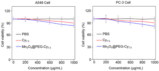 The cytotoxicity of Mn3O4@PEG NPs was assessed with a CCK-8 assay using PC-3 cells and A549 cells. Briefly, cells were seeded in 96-well plates at 20,000 cells per well in 200 µL culture medium. The cells were maintained in Roswell Park Memorial Institute (RPMI)-1640 containing 10% fetal bovine serum (FBS) and incubated at 37 °C in a humidified cell culture incubator with 5% CO2 atmosphere for 24 h. Mn3O4@PEG-Cy7.5 NPs solutions with different concentrations from 200 to 1000 μg/mL were added to each well, and the cells were subjected to a CCK-8 assay after being incubated for another 24 h. The cell viability was determined by measuring the absorption at 450 nm using a microplate reader. Cell viability was calculated using: cell viability (%) = (mean absorption value of treatment group/mean absorption value of control) × 100.