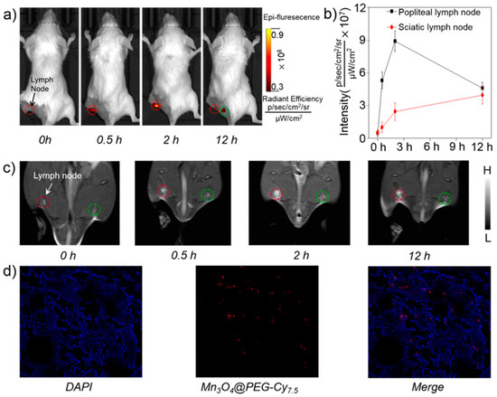 The lymphatic system plays a vital role in resisting disease invasion, and it is also a common site for tumor metastasis [3]. Therefore, precise identification of sentinel lymph nodes is of vital importance in both the prediction of cancer metastasis as well as determination of treatment options [7]. Considering Mn3O4@PEG-Cy7.5 NPs as good dual-modality FI/MRI agents in the biodistribution pattern in vivo, as a proof-of-concept, Mn3O4@PEG-Cy7.5 NPs were then used as non-invasive dual-modality FI/MRI probes for lymph node mapping. After Mn3O4@PEG-Cy7.5 NPs were subcutaneously injected into the left foot of normal healthy BALB/c mice (60 µL, 1 mg/mL), serial FI scans were carried out. As seen from Figure 6a, accumulation of Mn3O4@PEG-Cy7.5 NPs in the popliteal lymph node could be clearly seen at 0.5 h, 2 h and 12 h post-injection (red circle) (n = 3). Among them, the fluorescence signal intensity at 2 h was stronger than the other time points. In addition, it was worth mentioning that the sciatic lymph node at 12 h could also be observed clearly (blue circle). To further quantitatively and intuitively display the intensity variation, a representative ROI was extracted for each fluorescent image by the lymph node area, and the average intensity inside each ROI was calculated in Figure 6b, where the black and red line describe the intensity variation of Mn3O4@PEG-Cy7.5 NPs accumulated in popliteal and sciatic lymph nodes, respectively. In some ways, the above results further revealed that the accumulation of Mn3O4@PEG-Cy7.5 NPs in lymph nodes after injection was primarily due to the small size, which is well suited for uptake by the lymphatics.
