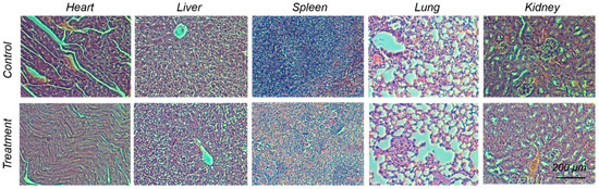 To investigate the potential in vivo toxicity of Mn3O4@PEG-Cy7.5 NPs, histological assessment was carried out by injecting Mn3O4@PEG-Cy7.5 NPs (20 mg/kg) into healthy BALB/c mice via the tail vein. PBS injections served as the control. Two weeks after the injection, mice were sacrificed and major organs (heart, liver, spleen, lungs, and kidneys) were sliced and stained by hematoxylin and eosin (H&E) for a histological analysis. As shown in Figure 7, no noticeable tissue/cellular damage was observed in all major organs, as compared to that obtained from the control group. For further quantitative evaluation, serum biochemistry assays were then conducted to investigate the influence of Mn3O4@PEG-Cy7.5 NPs especially on potential hepatic injury and kidney functions (Table S1). Analysis of four primary hepatic function indicators, including aspartate aminotransferase (AST), alanine aminotransferase (ALT), alkaline phosphatase (ALP), and total bilirubin (TBIL), as well as two kidney function indicators, including serum creatinine (CREA) and serum urea (UREA), demonstrated no obvious hepatic or kidney disorders in both the mice treated with Mn3O4@PEG-Cy7.5 NPs and the control injected with PBS on day 14 post-injection. These results suggest that Mn3O4@PEG-Cy7.5 NPs demonstrated no obvious toxicity in mice and may be a safe agent for biomedical imaging.