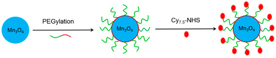The synthetic process of Mn3O4@PEG-Cy7.5 nanoparticles (NPs). PEG = polyethylene glycol.