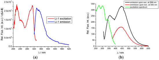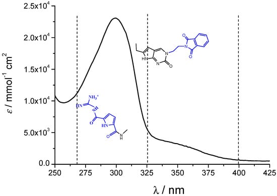 The studied compounds have two fluorophores (GCP and nucleobase) connected by a more (compound 3) or less (compound 2) flexible linker. As shown in Figure 2 and Figure 3 (and Figure S12 of Supplementary Materials for reference compound 1), excitation at λexc = 299 nm excites all fluorophores, while excitation at λexc = 355 nm excites only the nucleobase. That allows sequential fluorimetric studies, whereby fluorimetric response upon excitation at λexc = 299 nm monitors the impact of studied binding to all chromophores, while excitation at λexc = 355 nm is focused on the changes induced only on nucleobase-phthalimide moiety.