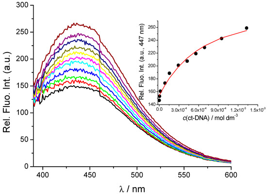 Fluorescence spectra changes of 2 (c = 2 × 10−6 mol dm−3) upon addition of ct-DNA at pH 7.0, sodium cacodylate buffer, I = 0.05 M, λexc = 355 nm. Inset: emission at 447 nm dependence on c(DNA) fitted to Scatchard equation [40,41].