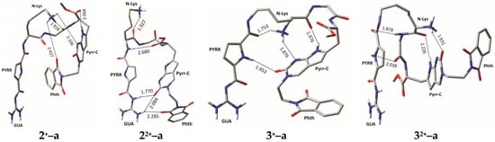 At pH = 7, system 2 loses an extra proton on the guanidine moiety and is present as monocationic 2+. In the most stable structure 2+–a the guanidine moiety is not involved in any hydrogen bonding, which obviously allows 2+ to interact with ss-poly A. The intramolecular stabilization in 2+–a predominantly occurs through the interaction of the protonated free amino group with (a) the imino nitrogen on the nucleobase (2.11 Å); (b) the carbonyl group on phthalimide (2.43 Å); and (c) the carbonyl moiety in the amide fragment (1.92 Å). Interestingly, only 0.6 kcal mol−1 above 2+–a, a structure 2+–b is also dominated by the intramolecular interactions with the protonated free amino group, but there the guanidine fragment is found in the stabilizing π–π stacking interactions with phthalimide (Figure S48 of Supplementary Materials), which likely affects its interactions with ss-polynucleotides other than ss-poly A. The structure with a non-interacting cytosine nucleobase is 9.6 kcal mol−1 less stable than 2+–a, which is clearly too high to have any impact on the potential pairing with ss-poly G.