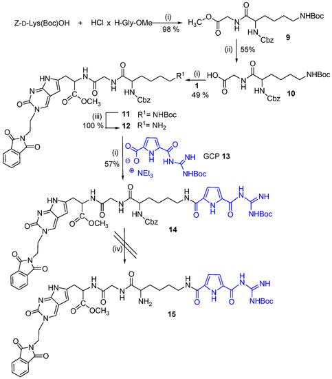 Having the fluorescent Pyrr-C-amino acid analogue 1 in hand, we decided to link it with the guanidiniocarbonyl-pyrrole unit (Boc-GCP-OH) [37] 13 through a Gly-Lys dipeptide bridge (Scheme 2). We planned to first attach the fluorescent Pyrr-C unit 1 to Gly-Lys dipeptide and the GCP 13 unit in the second step (Scheme 2). Starting from the commercially available Z-d-Lys(Boc)-OH and H-Gly-OMe hydrochloride, the Z-d-Lys(Boc)-Gly-OMe dipeptide 9 was synthesized in excellent yield by a standard coupling reaction using HBTU/HOBt as coupling reagents and the base, triethylamine in acetonitrile [38]. Dipeptide 9 was readily deprotected with 2 M NaOH in dioxane/H2O (v/v 3:1) giving 10. The same coupling procedure was applied for coupling of the Pyrr-C amino acid analogue 1 with Z-d-Lys(Boc)-Gly-OH dipeptide 10; the product 11 is obtained in moderate yield. The Boc-protecting group was removed with a mixture of CH2Cl2/TFA affording 12 in quantitative yield. In the next step, 12 was coupled with GCP 13 giving the conjugate 14. Unexpectedly, the removal of Cbz protecting group in 14 by hydrogenolysis failed and no deprotected compound 15 could be isolated.