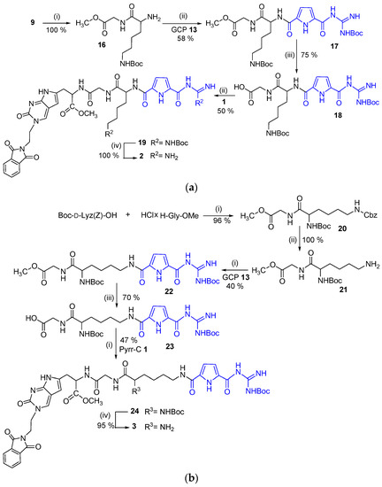 Hence, the synthetic approach was changed in the way that the GCP 13 is firstly attached to Gly-Lys dipeptide at either of the two (alpha-amino or side-chain amino) positions, and the obtained products are subsequently coupled with the fluorescent Pyrr-C unit 1 (Scheme 3a,b).