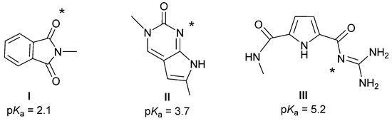 The pKa values calculated for I and II are slightly lower than those of succinimide (pKa = 3.9) and cytosine (pKa = 4.5) used as references for their evaluation. This implies that even at pH = 5 both of these fragments will predominantly be unprotonated. Interestingly, although guanidine (pKa = 13.6) and its derivatives provide some of the strongest organic bases know today [45,46,47], combining it to the carbonyl-pyrrole fragment significantly reduces its basicity to pKa(III) = 5.2, being a consequence of an extended conjugated π-system, which depletes the electron density from the guanidine imino nitrogen leading to much-reduced basicity. This suggests that at pH = 7, the fragment III will be neutral, while at pH = 5 it will assume monoprotonated form III+, thus putting our results in firm agreement with earlier experimental observations [22], and confirming that this fragment is predominantly responsible for the biological activity investigated here.