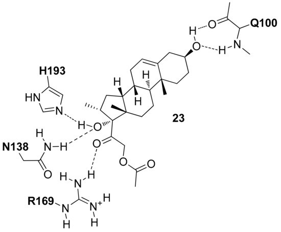 50 = 42 nM), was co-crystallized with the enzyme (PDB code 5IXS) and showed to maintain a binding mode comparable to that observed for the cycloexenones and dihydropyrones, forming the same H-bonds with the catalytic residues N138, R169, H193 and placing the conserved 2-chlorophenyl group within the pocket delimited by L165, D166, R169, D195, V234, V235 and A238 (