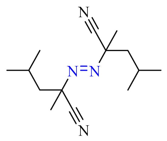 2,2′-Azobis(2,4-dimethyl)valeronitrile (ADVN) (the chemical structure is shown in Figure 1), a common azo compound, is an excellent free radical supplier for chemical processes. When azo is involved in an exothermic reaction, it can amply provide free radicals and energy for synthesis of organic compounds or polymers, such as styrene, methyl acrylate, epoxy resin, or propylene, as an initiator, cross-linking, or curing agent. However, ADVN has thermal instability and sensitivity because of its –N=N– structure, which may incur violent thermal decomposition by external fire, other igniting sources, or irradiation [4,5,6,7,8]. In the past, many thermal accidents have occurred because the inherent safety of chemicals is not explicit and the accident process is unexpected, which may result in the stored temperature, cooling system, or pressure relief system to be wrongly designed for safety considerations. Wanasekara et al. in 2011 indicated that the increase in the temperature and exposure time may lead to surface degradation and embrittlement of fibers. Wang et al. in 2008 mentioned that the UV light can cause the trans-cis isomerization mechanism of azo compounds (see Figure 2). Wang and Wang in 2008 also indicated that the azo with a trans isomer has high thermal stability and low energy intensity [9,10,11]. Thus, it is crucial that we understand the thermal hazard behaviors for azo which can be used efficiently and safely during operating, transportation, and storage [12]. In the past, most of the research of ADVN for runaway excursion has been the analysis of pure substances. However, the photo effect of ADVN has rarely been explored. Since ADVN has extreme photosensitivity with UV, the decomposition mechanism may be changed with the exposure time and mass [13]. Often, UV irradiation exists ubiquitously, and even its intensity may be different between location latitudes. Simultaneously, if the optical isolation of UV for the package or container is not complete, the photo effect may decrease the thermal stability of ADVN, resulting in the increased risk of a thermal runaway reaction [14].