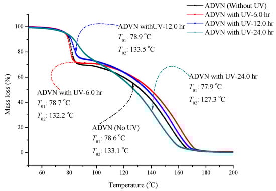 Figure 3 shows the mass loss versus temperature diagram from TG testing for ADVN and ADVN with different exposure durations of 6, 12 and 24 h of UV irradiation at a heating rate 20 °C/min. There are two decomposition stages for ADVN and ADVN exposed to UV, and the main decomposition stage is the second stage. We found that when ADVN was exposed to 6 and 12 h of UV, the profiles of the TG curve are not obviously different between each other, and for both T0 is 78 °C. However, although the T0 of the first stage of ADVN is close to ADVN exposed to 24 h of UV, the T0 of the second decomposition stage is curtailed from 132 °C to 127 °C and the mass loss is increased from 70% to 80%. According to the literature [17], T0 and mass loss can be used to determine the thermal stability for chemicals. Therefore, if ADVN is exposed to a UV intensity of 100 mW/m2 for over 24 h, the onset temperature and temperature of the maximum mass loss can decrease, causing abnormal aging or lessening the thermal stability during preparation, storage, transportation, and operating conditions.