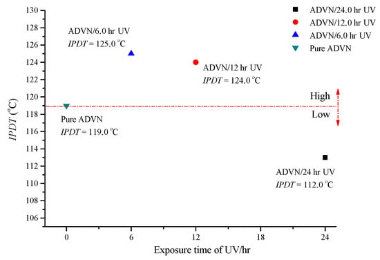 In Figure 4, we compared the IPDT for ADVN and ADVN with different exposure durations of 6, 12 and 24 h of UV irradiation, corresponding to values of 119, 125, 124 and 112, respectively. The results showed that when the exposure time of UV is 6 and 12 h, the IPDT could be increased, but the IPDT of ADVN is decreased after exposure to UV for 24 h. According to the literature, the thermal characteristics of chemicals are determined by energy and states of chemical bonds [18]. UV light can lead to the formation of the trans-cis isomerization of ADVN, causing a decrease in the thermal stability. In general, 24 h is usually considered as a standard emergent time or transportation for chemical industries, so that ADVN should avoid being in contact with UV irradiation under any conditions. The TG and IPDT results for ADVN exposed to 6, 12, and 24 h of UV at a heating rate 20 °C are listed in Table 1.