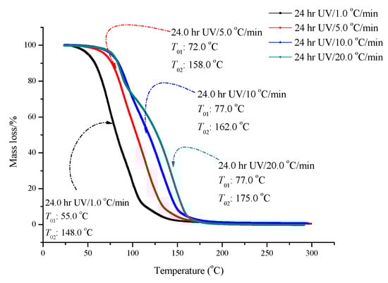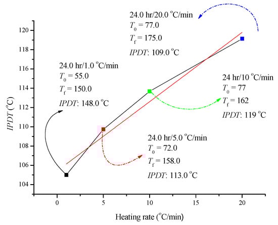 Based on the above-mentioned results, the following experiments focused on the UV effect for ADVN with an exposure time of 24 h. ADVN exposed to UV for 24 h was tested by TG at heating rates of 1, 5, 15 and 20 °C, as delineated in Figure 5. We also compared the IPDT for the results of four heating rates and the value of IPDT was increased from 101 °C to 119 °C with an increasing heating rate. Moreover, we plotted the IPDT versus the heating rate curve, and there was an extremely high R2 value from the linear regression. According to the results, the heating rate can determine the IPDT for the decomposition reaction of ADVN exposed to UV for 24 h. From the viewpoint of safer process design, when the operating conditions of a chemical process involving ADVN exposed to UV for 24 h need a low reaction temperature, a low heating rate should be proper and reliable. However, a high heating rate is better for a high reaction temperature. IPDT will be used as a basic, rudimentary, and dependable thermal stability parameter for future study. The linear dependence of IPDT with different heating rates is depicted in Figure 6.