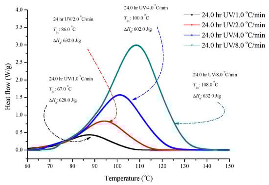 DSC thermal curves of ADVN with 24 h UV at heating rates of 1, 2, 4 and 8 °C/min.
