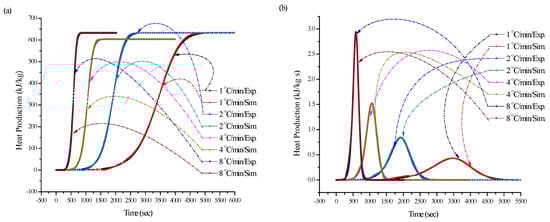 (a) Heat production versus time and (b) heat production rate versus time of model fitting with non-isothermal DSC at heating rates of 1, 2, 4, and 8 °C/min for ADVN with 24 h UV via experiments and simulations.