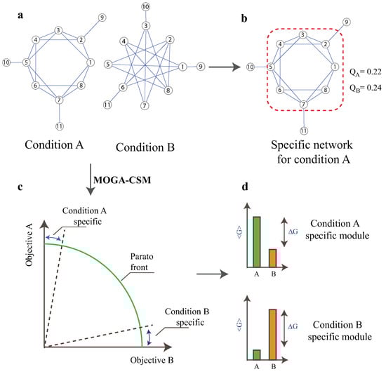 In this section, we first discuss the mathematical model for the condition-specific modules and then describe the MOGA-CSM. It is shown that the traditional algorithms cannot effectively characterize the specificity of modules within multiple networks [24] (Figure 1a,b). The ultimate goal is to develop a multi-objective GA for this issue (Figure 1c,d).