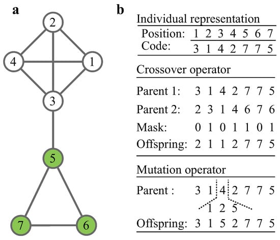 Individual representation: The locus-based adjacency representation is adopted [35,36,37]. In this graph-based representation, an individual is denoted by , where is one of the neighbors of node i such that is an edge belonging to one of the modules of the graph. The schematic example of representation for a graph (Figure 2a) is illustrated in Figure 2b, where the two modules are encoded.