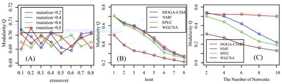 Performance of the compared algorithms on artificial multiple networks. (A) Parameter effect: modularity for different combinations of crossover and mutation rates for the artificial networks; (B) Performance as a function of the amount of noise in simulated networks, where modularity Q is used as the performance measure. Shown here are average Q values of 50 runs of each method at each noise level; (C) Performance as a function of the number of networks in the artificial networks, where Q is used as the performance measure.