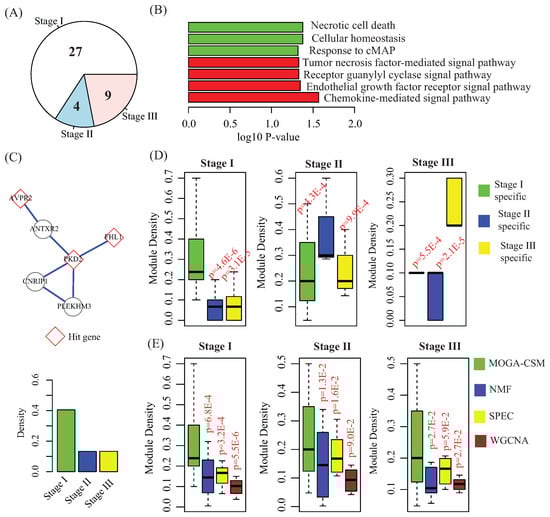 To check the specificity of the modules obtained by MOGA-CSM, we compared the distribution of densities of modules for each network. The results are shown in Figure 4D, where it is indicated that the connectivity of the specific modules can capture the specificity, because the modules are well connected in the corresponding network and weak in others. For example, the density of stage I-specific modules is more significant than that of modules in networks at stage II and III (stage I vs. stage II: p-value = 4.6 × ; stage I vs. stage III: p-value = 3.1 × , Student’s t-test).