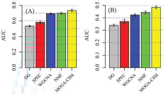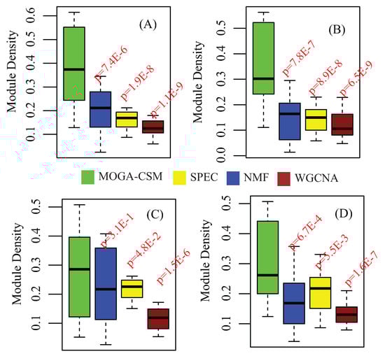 Finally, we compared the WGCNA, SPEC, NMF and MOGA-CSM algorithms in terms of discovering the condition-specific modules by applying them to the breast cancer networks. We compared the distribution of densities of the modules obtained for each algorithm, which are shown in Figure 4E. From these, it is easy to conclude that the MOGA-CSM is significantly better than the others, as the density of the modules obtained by MOGA-CSM was much higher than that of others. For instance, in the stage I network, the means of the density of the modules were 0.22 (MOGA-CSM), 0.17 (NMF), 0.19 (SPEC), and 0.12 (WGCNA) (MOGA-CSM vs. NMF: p-value = 6.8 × ; MOGA-CSM vs. SPEC: p-value = 3.2 × ; MOGA-CSM vs. WGCNA: p-value = 5.5 × , Student’s t-test). These results imply that the proposed algorithm is more accurate than state-of-the-art approaches for the specific module detection in biological networks.