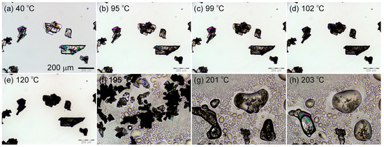 Microphotographs of 1-Hy1. (a–e) Dehydration in the temperature range from 30 °C to 120 °C, (f–h) condensation, sublimation and melting of 1-I.