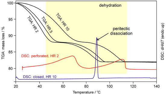 To study the influence of the atmospheric conditions on the dehydration behavior and associated processes, different experimental conditions were applied in the DSC investigations by using perforated or hermetically sealed crucibles, or varying the heating rates (DSC and TGA).