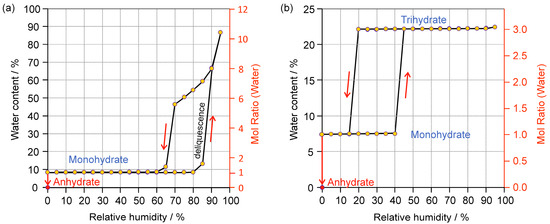 Gravimetric moisture sorption/desorption isotherms of (a) 1 and (b) 2. Arrows indicate the course of the experiments. The anhydrates of the two compounds were obtained by storing the samples over P2O5.