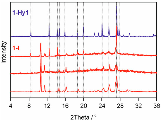 PXRD diffractograms of 2-I, 2-Hy1 and 2-Hy3.