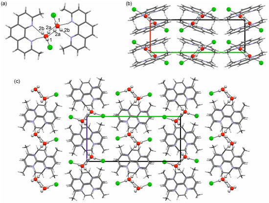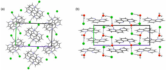 The anhydrate (1-I) crystallizes in the monoclinic space group P21/c, with Z’ = 1 [10]. The cations, planar molecules, are arranged in stacks (Figure 9a). The Cl− ion is coordinated by six phenanthrolinium cations. The strongest pairwise intermolecular interaction, accounting for −411.5 kJ mol−1, is the ionic N–H+···Cl− hydrogen bonding interaction (Supplementary Material, Table S2).