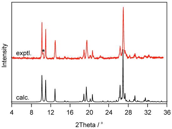 Experimental 2-I PXRD pattern obtained at RT compared with the simulated RT pattern for the calculated structure 1_745. Asterisk ‘*’ indicates a 2-Hy1 phase impurity.