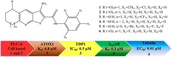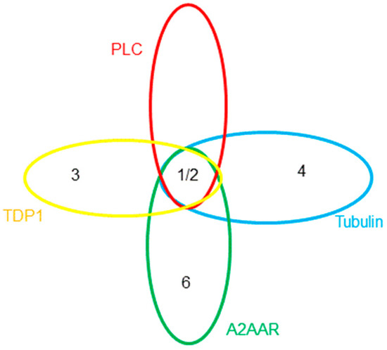 To complicate the interpretation of this data, different assay formats are used for each of the targets. Also, various derivatives of the TPs give the best response, i.e., 1 and 2 give excellent overall potency in cell-based assays pointing to PLC-δ inhibition, 3 gives the most favourable IC50 for TDP1, 4 has the best tubulin inhibition profile, whereas 5 has the lowest reported Kd against ATOX1, and, finally, 6 is the most active analogue for A2AAR. Since these derivatives were discovered by different research groups, not using the same compound collections and synthetic strategies, it is not surprising that various derivatives of TP were discovered and developed. Furthermore, each molecular target should have a unique structure-activity relationship, resulting in different TP derivatives being tested. When this is considered in terms of chemical space, Figure 2 can be produced to map locations of the active derivatives, in which each ellipse represents the active volume of chemical space for each target. Taking into account the available data, an extensive overlap between the aforementioned targets can be envisioned. It is currently not known which receptor/enzyme’s modulation produces the pronounced anticancer potential of the TPs or indeed whether a synergistic effect is responsible for the efficacy. For the further development of the TPs as potential clinical candidates, it is vital to elucidate the molecular mechanism responsible for its potency.
