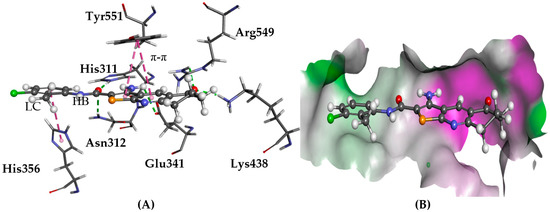 The docked conformation of 1 in the binding site of PLC-δ1 using ChemPLP. (A) Hydrogen bonds (HB) are depicted as green dotted lines between ligand and the amino acids Asn312, Lys438, Glu341, Arg549, His311, and π-π stacking, with Tyr551 shown with dashed purple lines; (B) 1 shown in the binding pocket with the protein surface rendered. Purple represents hydrogen bond donor regions and green depicts hydrogen bond acceptor regions.
