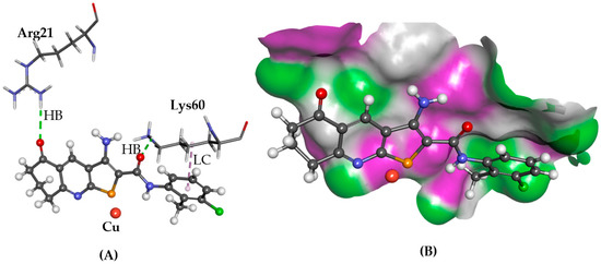 The docked conformation of 1 to the binding site of ATOX1 using GS. (A) Hydrogen bonds (HB) are depicted as green dotted lines between 1 and the amino acid Arg21. Furthermore, a lipophilic contact (LC) is shown as purple dashed lines between Lys60 and derivative 1; (B) 1 shown in the binding pocket with the protein surface rendered. Purple represents hydrogen bond donor regions and green depicts hydrogen bond acceptor regions.