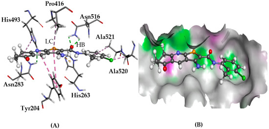 The docked conformation of 1 to the binding site of TDP1 using ChemPLP. (A) The hydrogen bonds (HB) are depicted as green dotted lines between ligand and the amino acids Asn283 and Asn516. Furthermore, lipophilic contacts (LC) are shown as purple dashed lines; (B) 1 shown in the binding pocket with the protein surface rendered. Purple represents hydrogen bond donor regions and green depicts hydrogen bond acceptor regions.