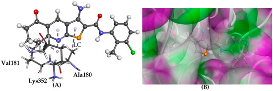 The docked conformation of 1 to the binding site of Tubulin-colchicine using ChemPLP. (A) Lipophilic contacts (LC) are shown as purple dashed lines; (B) 1 shown in the binding pocket with the protein surface rendered. Purple represents hydrogen bond donor regions and green depicts hydrogen bond acceptor regions.