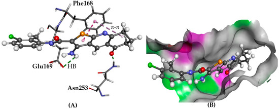 The docked conformation of 1 to the binding site of A2AAR using ChemPLP. (A) Hydrogen bonds (HB) are depicted as green dotted lines between ligand and the amino acids Asn253 and Glu169. π-π stacking with Phe168 is shown with dashed purple lines; (B) 1 shown in the binding pocket with the protein surface rendered. Purple represents hydrogen bond donor regions and green depicts hydrogen bond acceptor regions.